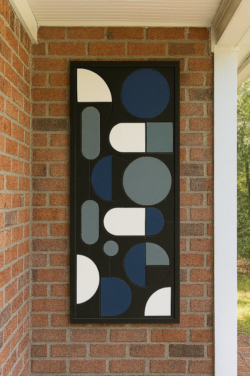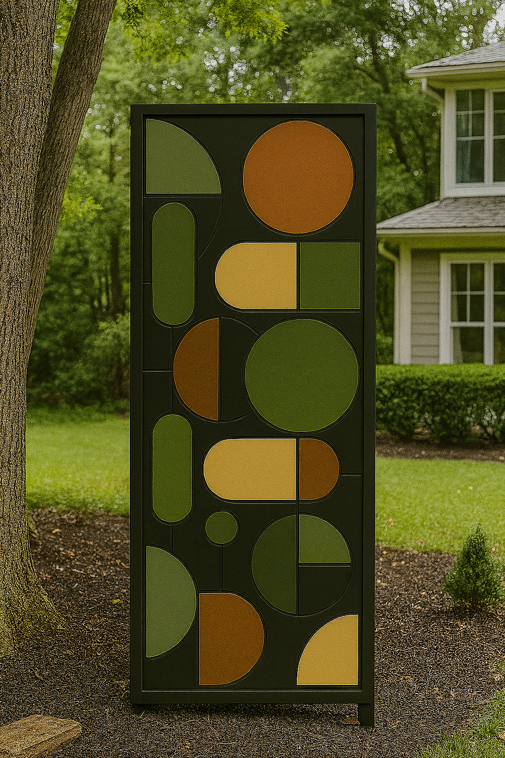 Each design is CNC machined into Armorite, an exterior-grade MDF (medium density fiberboard) used in residential trim work, then sealed with an industrial primer and finished with two coats of Sherwin-Williams Kem Aqua BP siding paint for exceptional outdoor durability. Choose from Modern Geometric, Abstract Nature, Art Deco, and Mid-Century Modern styles, all available in three curated color palettes.