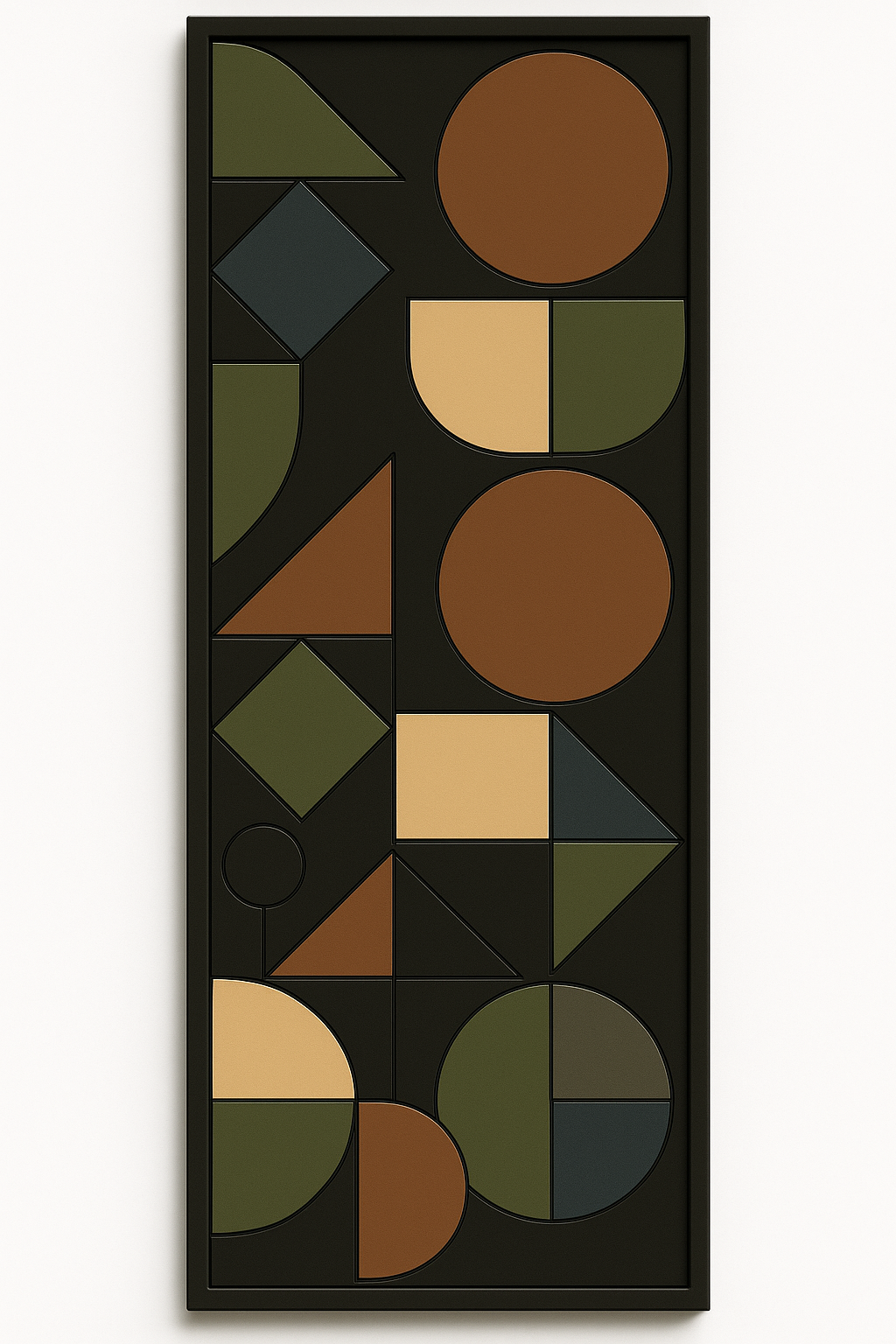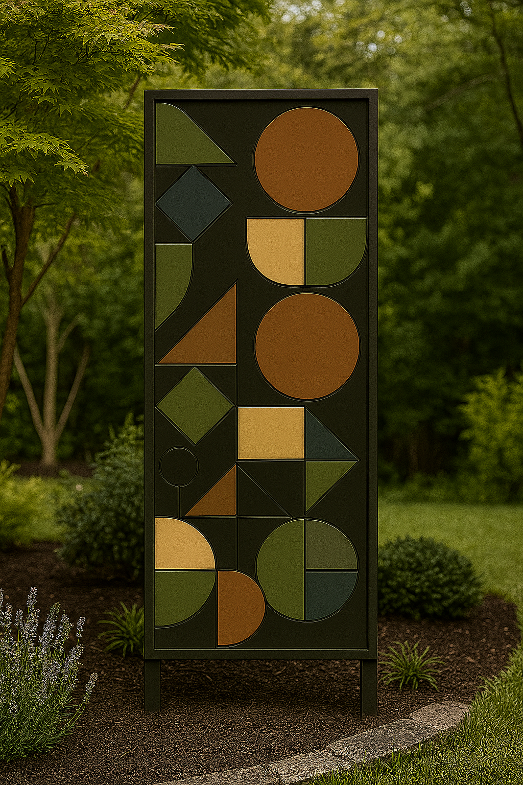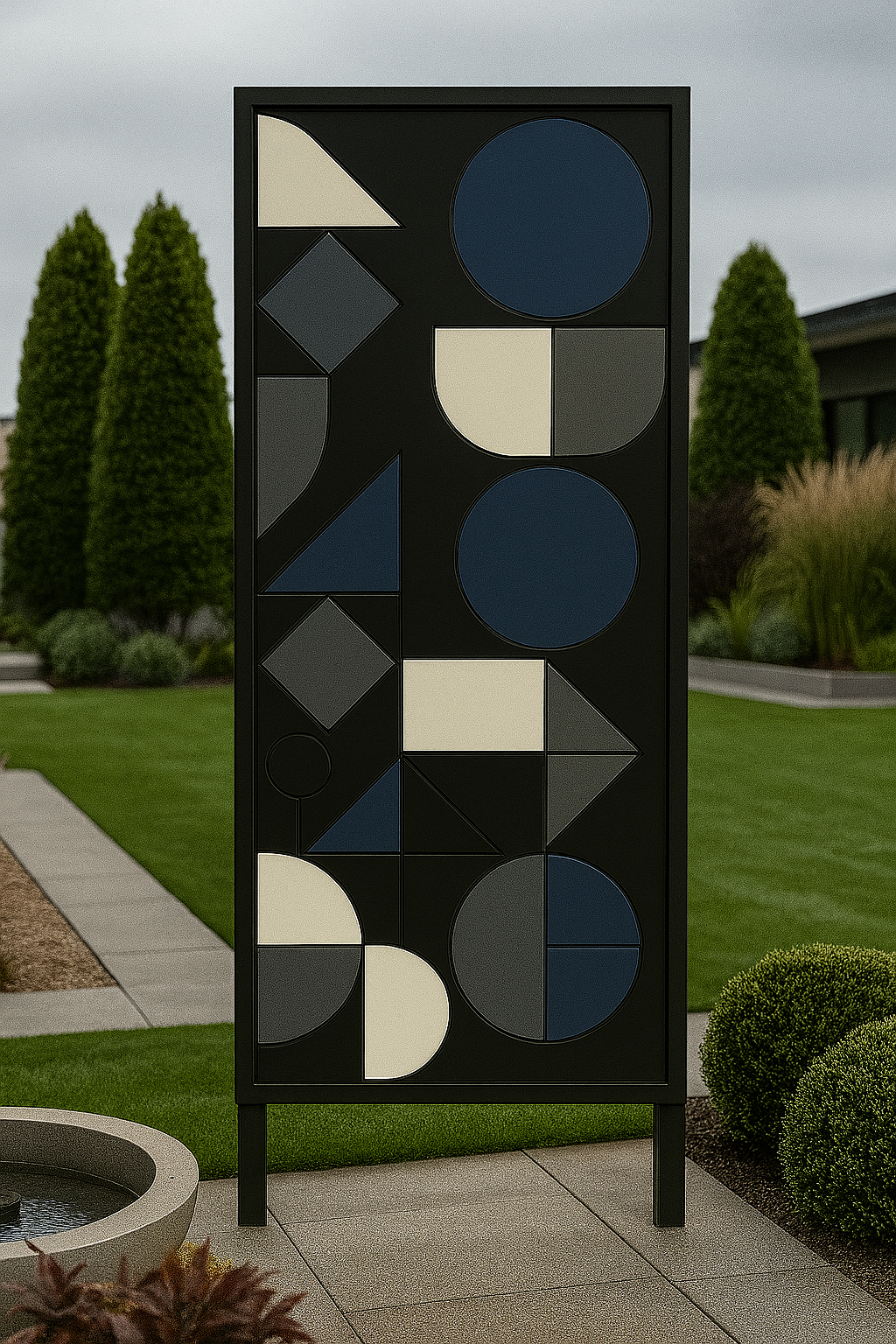 Each design is CNC machined into Armorite, an exterior-grade MDF (medium density fiberboard) used in residential trim work, then sealed with an industrial primer and finished with two coats of Sherwin-Williams Kem Aqua BP siding paint for exceptional outdoor durability. Choose from Modern Geometric, Abstract Nature, Art Deco, and Mid-Century Modern styles, all available in three curated color palettes.